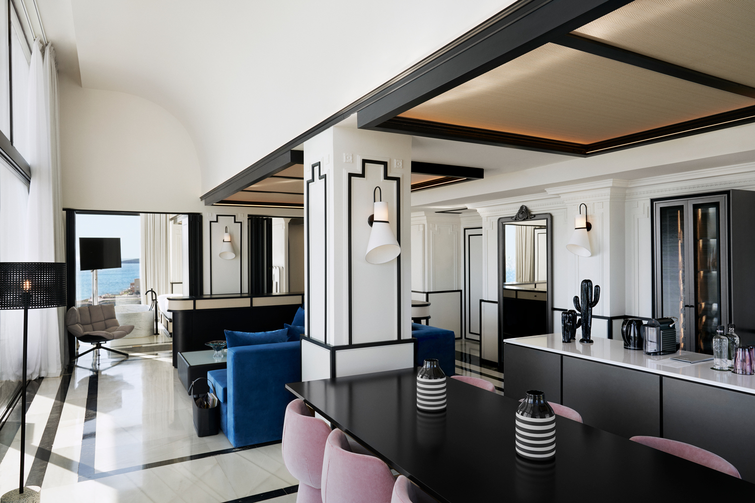 Todas las habitaciones deslumbran. Los acentos negros en las molduras y cabeceros otorgan un toque distintivo y contemporáneo que recuerda a los cortes de Chanel.