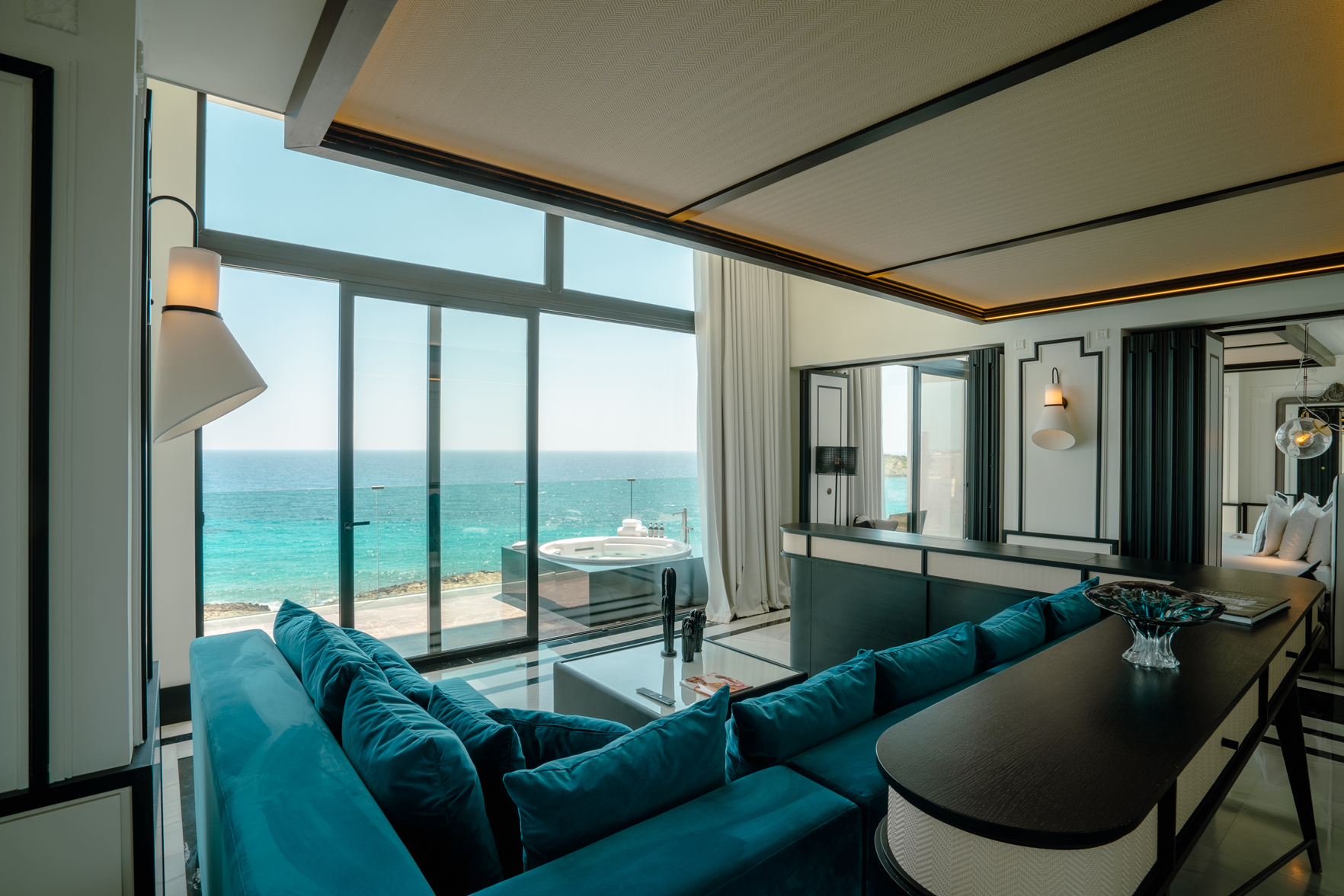 El pasillo de acceso a la habitación ofrece a los huéspedes la primera perspectiva de lo que se va a encontrar a continuación: una elegante sala de estar decorada con una mesa de madera que evoca la cestería tradicional ibicenca. Las elegantes paredes blancas con ribetes negros junto a los muebles de la década de los años 20 y las texturas propias de la moda de la época, aportan a la estancia una elegancia única. A todo este básico, se ha sumado un punto de calidez con detalles en tonos pálido de los sofás o los toques de madera de las puertas y del vestidor.